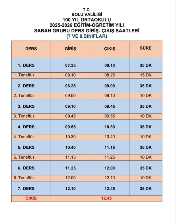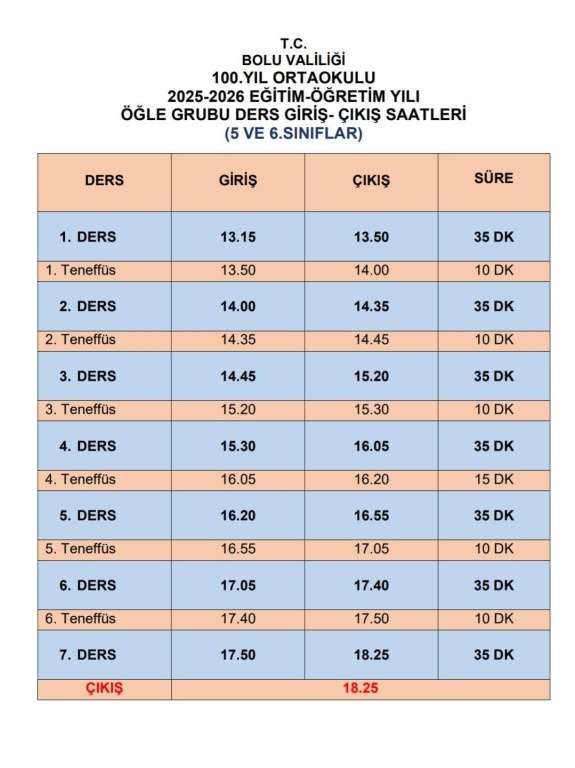 2025 - 2026 DERS GİRİŞ ÇIKIŞ SAATLERİ